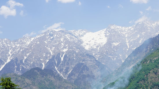 A magnificent view of Dhauladhar snow mountain range and Sahaja Yoga Ashram for Meditation free courses